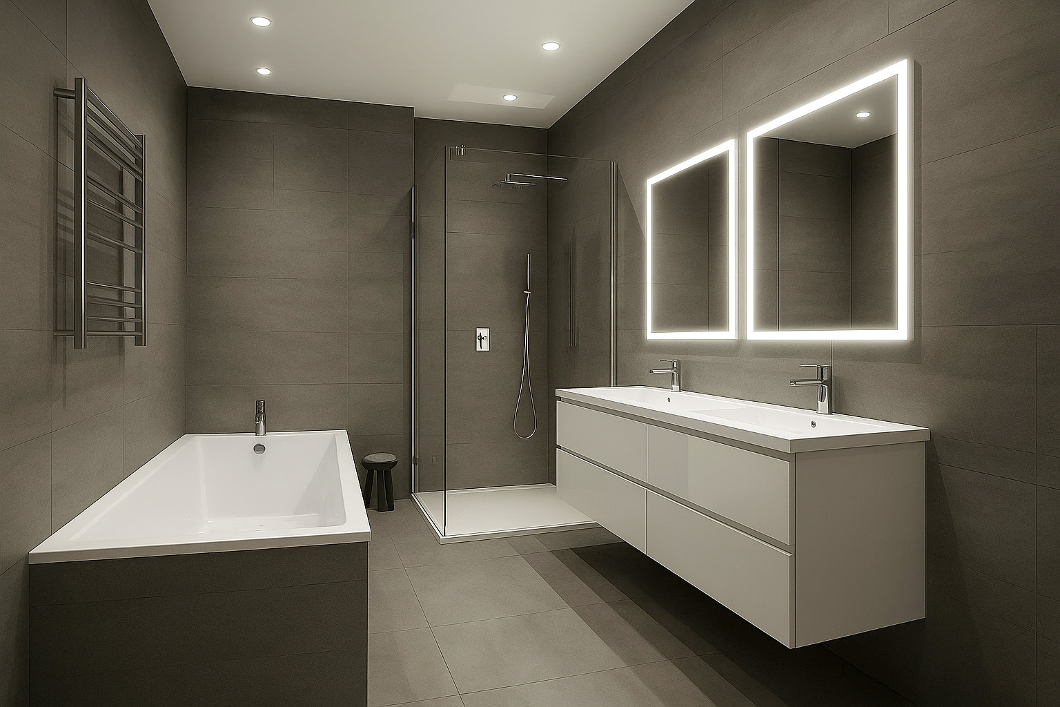 - Salle de bains avec baignoire, grande douche à l’italienne, WC suspendus et sèche serviette