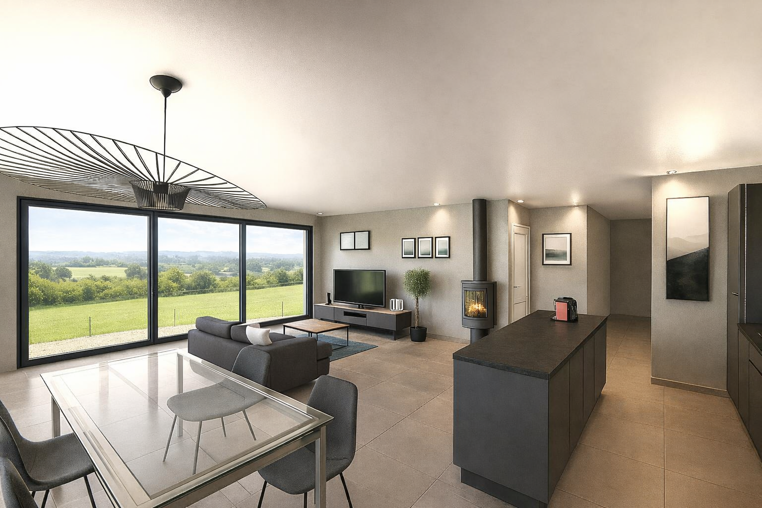 . Une pièce de vie de 47 m² lumineuse avec une grande baie vitrée orientée sud et sud-ouest, donnant sur la terrasse